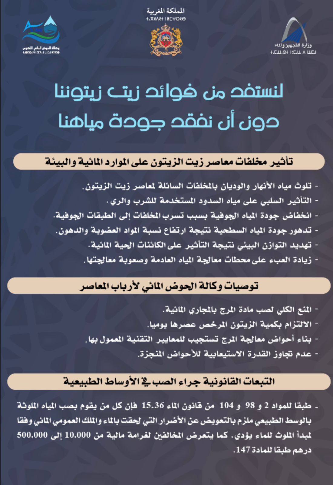 وككل سنة، تؤكد وكالة الحوض المائي اللكوس دعمها الكامل لتطوير قطاع الزيتون لما له من أهمية اقتصادية واجتماعية، لكنها تشدد في الوقت نفسه على ضرورة الحفاظ على الموارد المائية والبيئية، حتى نستفيد من خيرات زيت الزيتون دون أن نفقد جودة مياهنا!